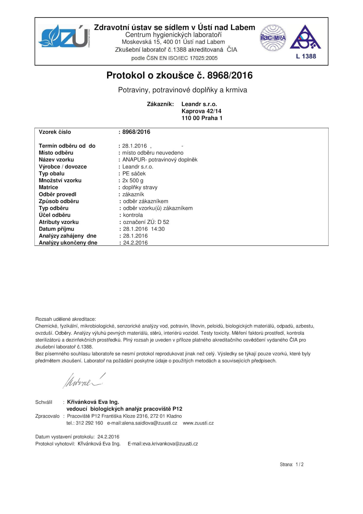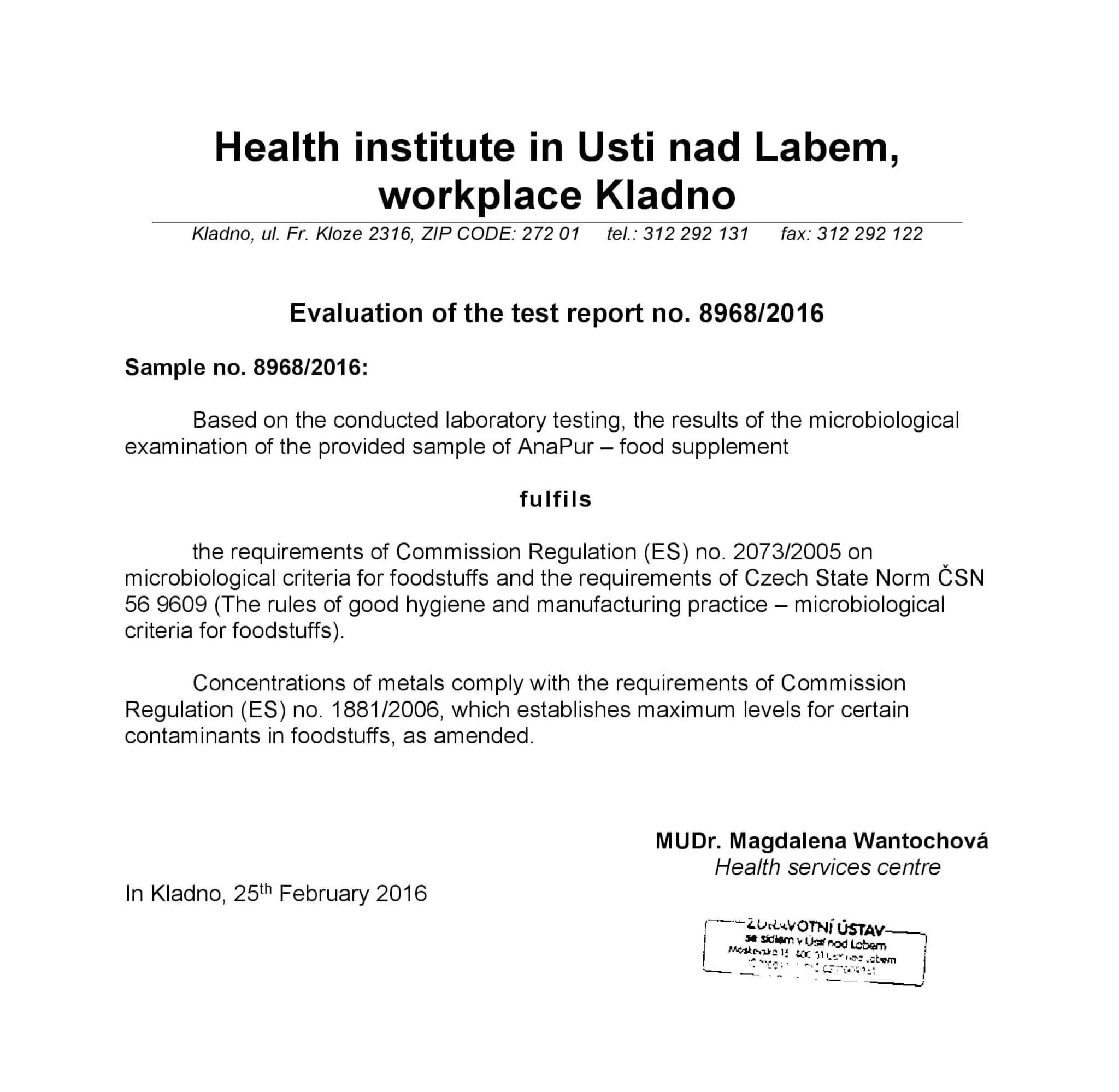 Pro analýzu jsme tedy využili služeb akreditované laboratoře Zdravotního ústavu se sídlem v Ústí nad Labem, kam jsme vzorek odeslali. AnaPur jsme skladovali v normálních pokojových podmínkách a do laboratoře jsme ho poslali po čtyřech měsících, tedy na konci své doporučené lhůty spotřeby.